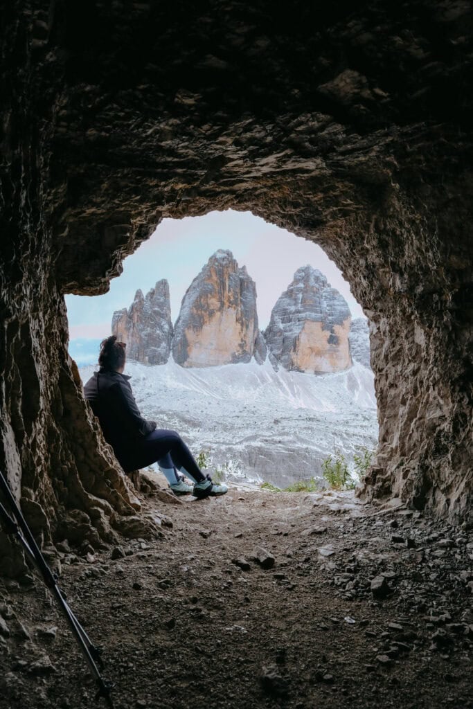 - Juste au-dessus du refuge, d’anciennes petites grottes creusées dans la roche offrent une vue unique, comme encadrée, sur les sommets. Elles servaient autrefois de postes d’observation pendant la Première Guerre mondiale. Aujourd’hui, elles sont accessibles en quelques minutes de marche depuis le refuge et constituent un spot photo spectaculaire.
