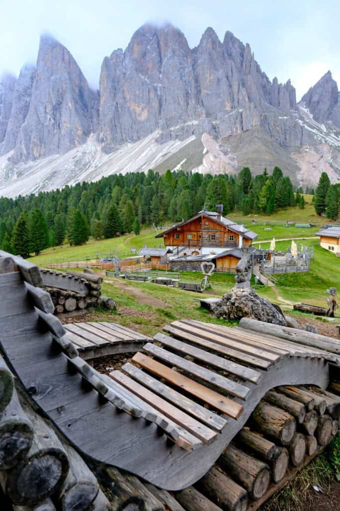 Le refuge Geisler Alm est un restaurant d’alpage perché face au massif des Odle, avec une vue à couper le souffle. Sur place, tout est pensé pour les randonneurs : bains de soleil en bois, balancelle panoramique et grande terrasse pour déjeuner avec les sommets en toile de fond. Un endroit où il fait bon s’attarder (goutez leur tiramisu !), surtout sous le soleil.