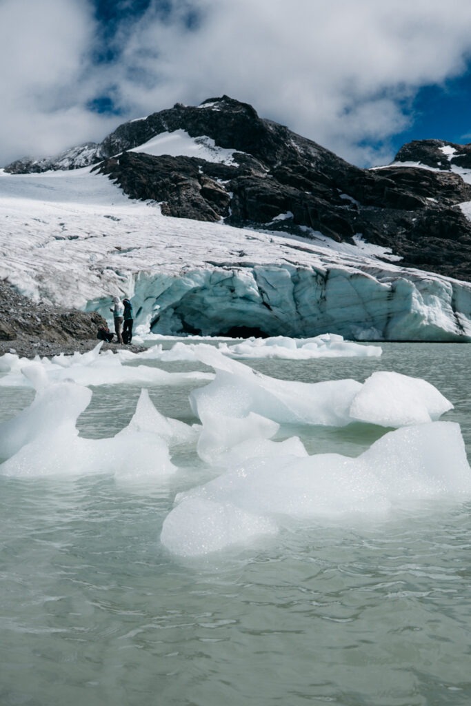 Je ne saurais pas vraiment décrire ce que j’ai ressenti à cet instant. Une falaise de glace plonge directement dans les eaux du lac. Des petits icebergs flottent à la surface. Le glacier craque, gronde, laisse parfois tomber des blocs dans un vacarme sourd. On entend le glacier vivre. C’est à la fois fascinant et un peu intimidant. Le glacier du Grand Méan culmine à 3 260 mètres — il vous domine de toute sa hauteur.