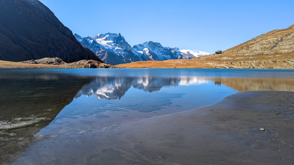 Le plateau d’Emparis est avant tout une randonnée panoramique accessible, avec des sentiers larges et peu techniques. Le terrain est régulier et permet d’évoluer longtemps en altitude sans dénivelé excessif, ce qui en fait un itinéraire idéal pour profiter de la vue sans difficulté majeure. Les lacs, notamment le lac Noir et le lac Lérié, ponctuent le parcours et offrent de superbes reflets des sommets environnants. Lorsque l’eau est calme, la Meije s’y reflète parfaitement, offrant l’un des paysages les plus photogéniques des Alpes.