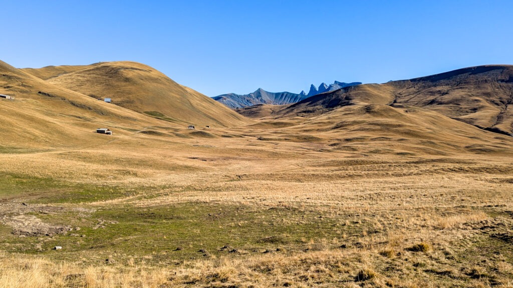 Le plateau d’Emparis est un immense alpage ondulant, suspendu face aux glaciers de la Meije. Le contraste entre la douceur du relief et la verticalité des sommets en face est saisissant.